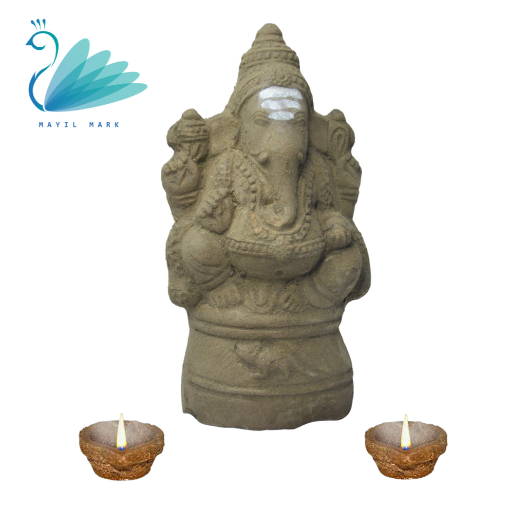 - The Vinayaga statue and panchagavya diya are made from 100% biodegradable materials and handcrafted by skilled artisans in India.